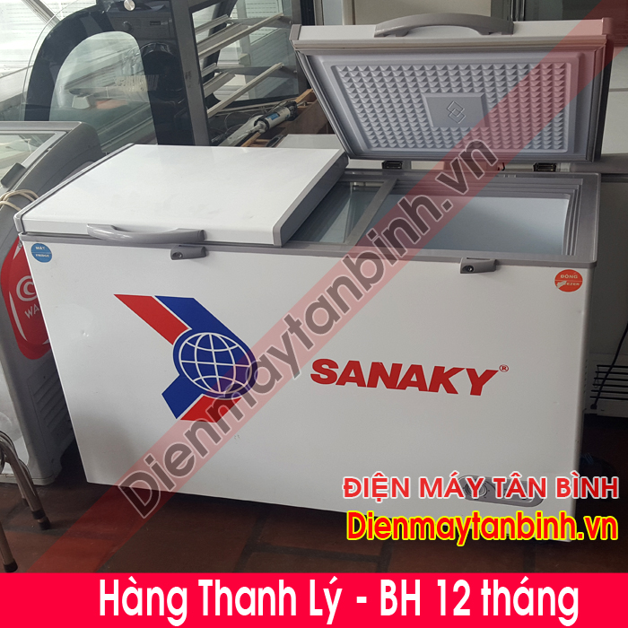 Kho hàng công ty Điện Máy Tân Bình cần bán thanh lý tủ đông cũ hiệu Sanaky, loại tủ đông 2 ngăn đông mát. Model đời mới, 2 nắp mở lên, côi phẳng chống móp méo. Tủ còn mới 90%, bảo hành 12 tháng, giao hàng tận nhà miễn phí. (Xem giá mới: Sanaky VH-4099W1)